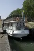 Lastfartyget JOHN ERIKSON vid sluss i Sjötorp längs Göta kanal. I bakgrunden en ledfyr.