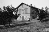 Valdeborg Johansson med hund i famnen tillsammans med sina elever utanför skolan, våren 1934. Text på fotots baksida: "Småfolk". Samma elever som på bild 1992_0007, 0008. Ur Valdeborg Johanssons fotoalbum.