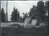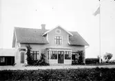 "Husmodersskolan". Låg byggnad med hög skorsten, stenhög och stång.