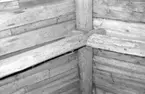 Östra flygeln på Gunnabo, väggbeklädnad i rummet bakom förstugan. Papper klistrat på timret, marmorerat i blå toner. Härpå är en panel målad nertill, rutverk i svart på blåvit grund.