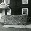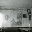 Interiör från så kallade Borgmästargården i Gränna. Målade väggfält på ömse sidor om en dekorerad kakelugn.