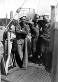 Porträtt av fyra värnpliktiga som står i en mindre segelbåt