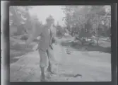'Hans Lohmander sittande vid skrivbord framför fönster på evertebratavdelningen. Interiörbild med skrivbord, bordslampa. Hans Lohmander i arbete. På arbetsbordet ligger glasögon. Kläder. Klädsel. :: :: Ingår i serie med fotonr. 7120 med diverse bilder från Hans Lohmander.'