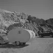 Vägstation Y1, Östavall. Förrådsbyggnad. Upplag av bränslefat. Personbil Volvo PV.