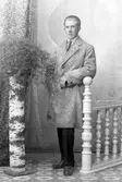 Porträtt av Algot Wallin som håller på att fläta en korg. Bakom honom syns flera utav hans alster. Tre flätade korgar, en lampa med flätad fot och skärm samt en äggkorg i form utav en höna.