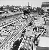 Invigningen av nya Lokstallbron som går från Barnhusstranden till Torsgatan. Kommunalarbetarna Bror Eriksson och Karl- Albert Nyström klipper av det blågula bandet bakom dem Borgarrådet Helge Berglund