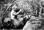 Foto av militärer poserande framför en stuga med träd och gärdsgård i bakgrunden. Text i album: "Fr v. Marks, Lilliehöök, G, Petré, Sundin och Warberg".