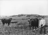 "Ryktaren August Carlsson, Mostorp Getinge." August står ute på ett gärde med tre behornade och tjudrade nötkreatur. Han håller i en stor klubba som troligen används för att fästa kedjan i marken, som via nosringen sitter runt tjurens (?) huvud.