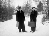 Vykort med motiv över entren till järnvägsstationen i Sandviken. Utanför står två kvinnor bredvid en hästskjuts lastad med resekoffertar.
