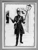Brevbärare fotograferad iklädd regnkrage. Bilden är införd i 1962 års beklädnadsreglemente. Regnkragen utgjore en skyddspersedel och tilldelades den uniformspliktiga tjänstemannen vid behov. Regnkragen är av plastbelagd bomullsväv.