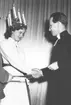 Ett luciatåg går längst ett bord i en stor sal. De har levande ljus i händerna och lucian har en ljuskrona. Lucian har ett rött sidenband runt midjan och tärnorna har glitter.