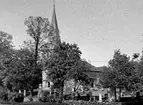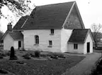 Dalhems kyrka, putsad fasad, valvfönster och kyrkogård. Foto från renoveringen 1993.