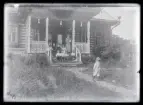 Syskonen Märta, Hilding och Anna Brattberg från Bua, stående på stentrappa med villan på Ramdalen i bakgrunden.