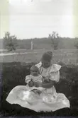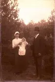 En okänd man med en flicka som står på en gunga och en baby, utomhus. Ca 1910.