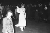 Tre musicerande tomtar; en med dragspel och en har gitarr. En tunna framför dem är märkt med "Luciainsamlingen". Beställare: Tage Sandberg.