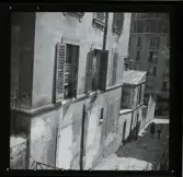 Utsikt från Lilla Glasberget mot bebyggelse i Åby, Mölndal, omkring 1975-1980. Närmast till vänster ses hus vid Svanegatan. Närmast till höger huset Roten K 32 vid Franckegatan.