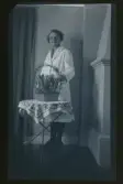 "Gluggen, Axels moster Sofia Karlsson 80 år." Porträtt av en kvinna som sitter vid ett bord med gratulations-blommor.