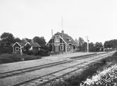 TJ lok 1 med tåg vid stationen. Stationen byggdes 1906. Loket tillverkades 1906.