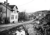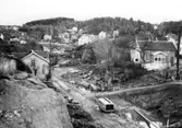 Borttagande av räls och markarbete där nuvarande Badhusparken ligger. Till vänster Gamla Badhuset, bak i bilden kvarteret Knape.