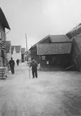 Gatuvy från Västra Vallgatan i Varberg, två bilder. Porträtt av en man, möjligen "Mauritz i Sp" (notering i negativalbum), där Sp står för Spannarp. Han var en slaktare som stod på torget med sina varor. Mannen är klädd i överrock och hatt. På den lilla byggnaden till höger på bild 1 sitter en butiksskylt för "SKRÄDDERI AFFÄR KLAS GLANS", kv Gästgivaren. Bebyggelsen bakom butiken ligger i kv Läkaren. Mellan kvarteren går Bäckgatan och på bild 2 ser man hörnen av Gerlachska huset samt prästgården närmast i bild.