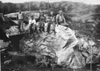 Enligt senare noteringar: "Gruppbild tagen på Saltkällans brygga. Lastning av fältspat (gryn) för båttransport till Trollhättan. Bland båtarna förekom namn som "Jonita".