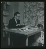 509 Hammenhög v för Allers. En man sittandes vid skrivmaskin. På bokhyllan bakom honom står modellfartyg.