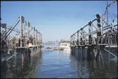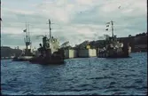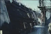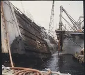 Vasa strax efter det sista lyftet, liggandes mellan bärgningspontonerna, Oden och Frigg.