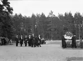 Begravningståg på en kyrkgård. Bäraren närmast till vänster är f d poliskonstapel A R Söderberg från Gränna.