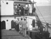 Enligt fotografens notering: "Shiftas "galarne" ifrån storlucka ned på deck, innan vi kom in till Delagas Bay. Den som står längst akter, närmast rören, är en Lincoln bagge. De har inga horn. Jag lägger en lock af ull, klippt från ryggen af denna bagge. Det är nog inte det längsta. Äfven lägger jag en liten "ulldott" från en Merino. Se hur fin den är".