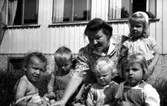 "Älsklingsbarnet" Håkan Carlsson och andra barn med en lärare på Krokslätts daghem, Dalhemsgatan 7 i Krokslätt. Under Margit Emilssons (gift Wannerberg -52) praktik som biträde 1945-10-01 - 1946-08-01. "Håkans charm och hans rara föräldrar bidrog till att jag valde yrket 'barnträdgårdslärarinna'. Jag var otröstlig när jag skildes från Håkan - då jag slutade för att börja på seminariet." / Margit Wannerberg.