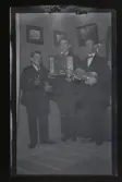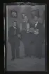 "Albin, Gunnar, John Karlsson, Fogelstad" Tre bröder poserar med fioler och dragspel.