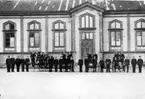 Noraskola brinner 18 februari 1966 Det brinner i en skola i Nora en vinterdag. Fyra uniformerade brandmän och en civilkläd man syns stående vid sidan av vattenpump. En av brandmännen har riktat ett vattenstråle mot skolbyggnads fasad. Det syns rökutveckling på skoltaket.