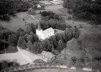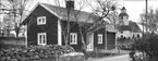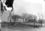 Hed sn, Hed kyrka. Kyrka och bostad i bakgrunden. I förgrunden åker och en man med hästkärra.
