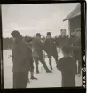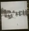 Bildtryck. Fisk som hänger på torkställningar. Text: "Fiskberedning."