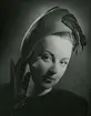 Porträtt av kvinna med hatt i brun velour av Suzanne Talbot. Hatt använd vid franska avdelningens uppvisning september 1947.