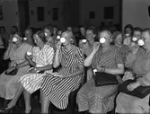 Tolv kvinnor står uppställda vid ett bord och ler mot kamernan. På bordet framför dem ligger frukter och köksredskap. Matlagningskurs på Örserums brunn 1962.