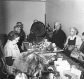 Grupp fem personer vid bordet, bostadshus.