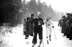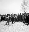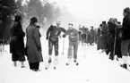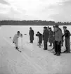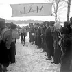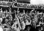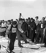Ishockey klar 31 januari 1966 Ett ishockeylag i idrottskläder samt med ishockeyklubbor i händerna står uppställda på isen för att bli fotograferade. En fotograf med kamera sitter framför dem på isen. Publik står på läktaren och betraktar det hela.