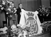 "Jubilerande H. S. B. i Upsala lovordas", arkitekt Sven Wallander högtidstalar, Röda kvarn, Uppsala april 1943