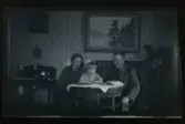 "Skogvaktarfamiljen Judit och Jakob Johansson, Bergåsa" En familj sitter i en soffa och läser i böcker som ligger på ett runt bord framför dem.
