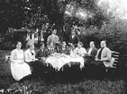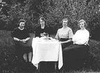 Kaffebjudning i trädgården med kvinnor och en man, sannolikt i Sverige