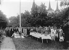 KAFFEGÄSTER I TRÄDGÅRD INVID KYRKAN.