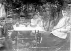 Exteriör. Två damer och en skäggprydd herre vid kaffebord framför litet hus med snickarglädje. Gullspångssamlingen. Bilder från Gullspång med omnejd.