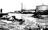 Nora-branden efteråt, 19 februari 1966 I förgrunden syns det en man som är klädd i en mörk rock. I bakgrunden skymtar det som är kvar av byggnaden efter brand. Istappar hänger från byggnaden.