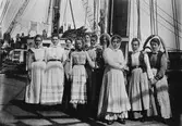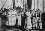 "Splitvedsjäntor" ombord på en skuta. Tredje från vänster: Angela Schelin, fjärde Rönnqvist, Långrör andra från höger. 1898-1903.