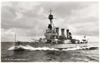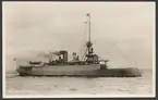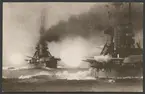 Reproduktion av en tavla av H. af Sillén. Motiv: pansarfartyg under skjutning.