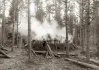"Mästerkolaren" Karl Fredrik Johansson med kol framför en nytänd mila vid Skyttorp