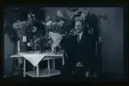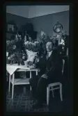"Valfrid Eriksson, kyrkovaktmästare, Skoga, Äsköping." Porträtt av en man som sitter vid ett bord fullt av gratulations-blommor.