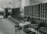 "Barnskor, interiör". Butik, stolar. Hyllor med lådor.