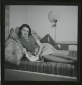 584 Brunsviks Folkhögskola. En ung kvinna sitter och läser och röker pipa.
